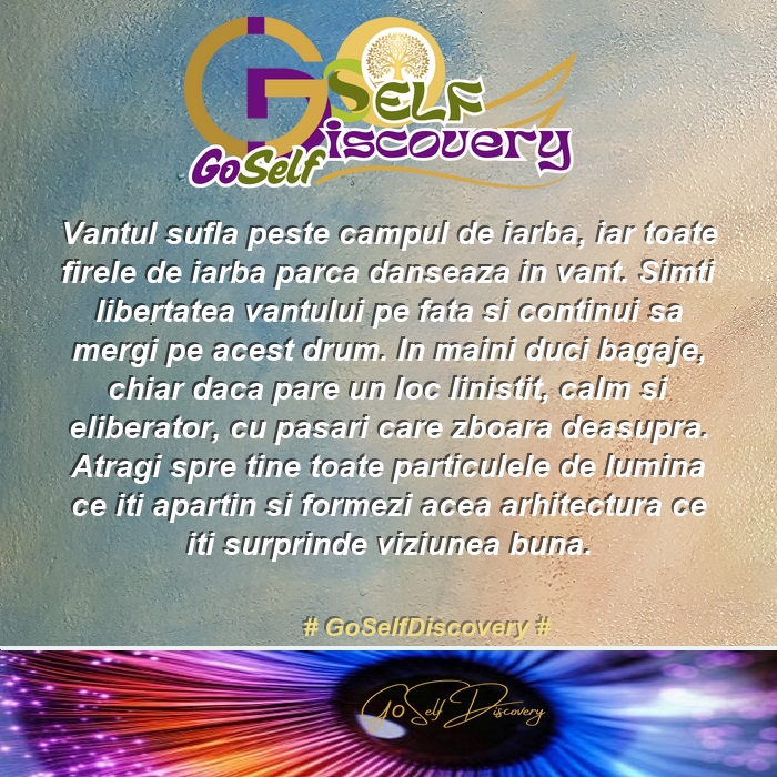 Formezi acea arhitectură ce iți surprinde viziunea bună Vântul suflă peste câmpul de iarbă, iar toate firele de iarbă parcă dansează în vânt. Simți libertatea vântului pe față și continui să mergi pe acest drum. În mâini duci bagaje, chiar dacă pare un loc liniștit, calm și eliberator, cu păsări care zboară deasupra. Atragi spre tine toate particulele de lumină ce iti aparțin și formezi acea arhitectură ce iți surprinde viziunea bună.Inspirat cu înțelepciune de GOSelfDiscovery (411Char si Evaluat la: 8)