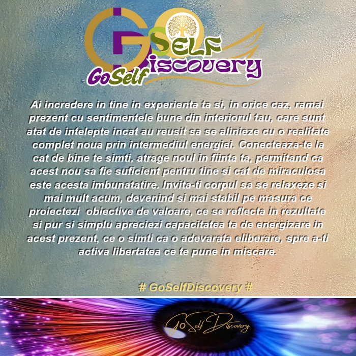 Ai încredere în tine în experiența ta Ai încredere în tine în experiența ta și, în orice caz, rămâi prezent cu sentimentele bune din interiorul tău, care sunt atât de înțelepte încât au reușit să se alinieze cu o realitate complet nouă prin intermediul energiei. Conectează-te la cât de bine te simți, atrage noul in ființa ta, permițând ca acest nou să fie suficient pentru tine și cât de miraculosa este acesta imbunatatire. Invită-ți corpul să se relaxeze și mai mult acum, devenind și mai stabil pe măsură ce proiectezi obiective de valoare, ce se reflectă în rezultate și pur și simplu apreciezi capacitatea ta de energizare în acest prezent, ce o simti ca o adevărata eliberare, spre a-ti activa libertatea ce te pune in miscare.Inspirat cu înțelepciune de GOSelfDiscovery (737Char si Evaluat la: 8)